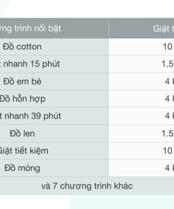 Chương trình giặt nhanh 15 phút cho phép bạn giặt nhanh chóng các loại quần áo bằng sợi cotton hay vải tổng hợp bị bẩn nhẹ, vết bẩn sáng màu, hoặc quần áo cần làm mới với khối lượng giặt cho phép ở chương trình này là 1.5 kg, giúp bạn tiết kiệm đáng kể thời gian chờ đợi.