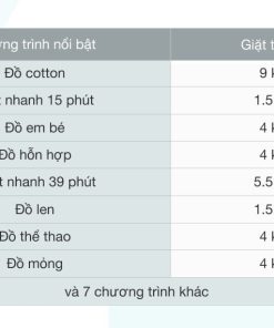 Máy giặt được trang bị 15 chương trình giặt (xem chi tiết tại bảng thông số kỹ thuật) bao gồm: Chế độ yêu thích, giặt chăn ga, giặt nhanh 15 phút, giặt nhanh 39 phút, giặt tiết kiệm, làm đầy lồng giặt 60 phút, vắt, vệ sinh lồng giặt, xả + vắt, đồ cotton, đồ hỗn hợp, đồ len, đồ mỏng, đồ thể thao, đồ trẻ em. Chương trình giặt đồ len sẽ giúp bạn dễ dàng giặt sạch những món đồ được làm từ len cho phép giặt máy mà không sợ bị hư hỏng.