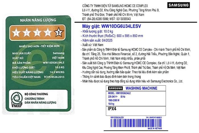 Máy giặt Samsung AI EcoBubble Inverter 10 kg WW10DG6U34LESV là lựa chọn hoàn hảo cho những gia đình yêu cầu cao về sự tiện nghi, sạch sâu và tiết kiệm năng lượng. Nhờ tích hợp công nghệ AI, khả năng kết nối thông minh và bảng điều khiển thân thiện, sản phẩm không chỉ giúp giặt sạch hiệu quả mà còn mang lại trải nghiệm sử dụng hiện đại và linh hoạt trong từng chu trình.