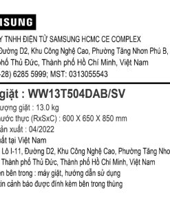 Máy giặt Samsung Inverter 13 kg WW13T504DAB/SV Model 2022 – loại máy giặt lồng ngang giặt mạnh mẽ, hiệu quả hơn, chống rung ồn tốt nhờ công nghệ VRT Plus, tiết kiệm điện với Digital Inverter, cùng công nghệ giặt sạch thông minh mang đến hiệu quả giặt tẩy đầy hài lòng cho người dùng.