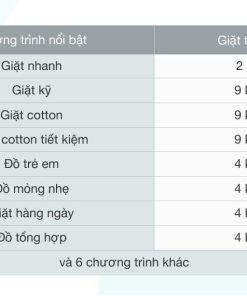 – 14 chương trình giặt giũ được tích hợp sẵn, giải quyết được các vấn đề giặt giũ từ cơ bản đến nâng cao của các thành viên trong gia đình: giặt nước nóng, đồ cotton, đồ trẻ em, giặt nhanh, giặt sơ, giặt kỹ, đồ len, đồ mỏng nhẹ,… (xem thêm tại bảng thông số kỹ thuật). Với chương trình giặt nhanh, bạn sẽ tiết kiệm kha khá thời gian giặt giũ mà vẫn đảm bảo hiệu quả giặt sạch (với những loại đồ ít bẩn hay cần làm mới quần áo).