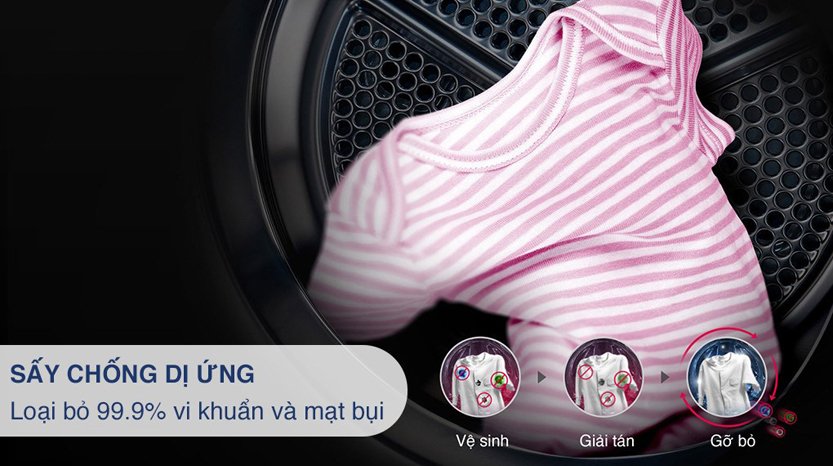Là một trong những ưu điểm, tính năng vượt trội của sản phẩm. Với chế độ này, máy sấy sẽ tiêu diệt đến 99.9% vi khuẩn và mạt bụi còn sống, tránh tình trạng dị ứng, đem lại sự thoải mái, dễ chịu cho người dùng khi mặc quần áo.