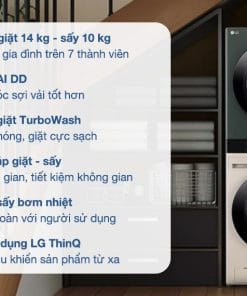 Tháp giặt sấy LG WashTower Inverter giặt 14 kg – sấy 10 kg WT1410NHE là giải pháp giặt sấy hữu hiệu với một bản điều khiển trung tâm duy nhất. Sản phẩm được tích hợp 8 chương trình giặt, 10 chương trình sấy được cài đặt sẵn, giúp giặt quần áo sạch sẽ nhanh chóng và bảo vệ vải tối ưu với công nghệ TurboWash360, Công nghệ AI DD, dùng tiết kiệm điện cùng công nghệ Dual Inverter.