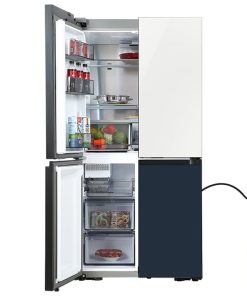Tủ lạnh Samsung Inverter 599 lít RF60A91R177/SV có thiết kế 4 cửa kiểu Pháp sang trọng, kết hợp với mặt kính Glam Glass đầy tinh tế cùng tông màu trắng – xanh Navy hiện đại tạo điểm nhấn cho không gian bếp.