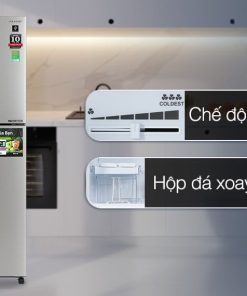 – Phần ngăn đá có một kệ khay đá để ngăn ra làm đôi, tiện lợi hơn trong quá trình bảo quản và sắp xếp thực phẩm. Có hộp đá xoay có thể dễ dàng làm các viên đá nhỏ và bỏ ra ngoài khi cần tăng không gian lưu trữ. Phần cánh tủ có thêm khay đựng để đồ tiện lợi.